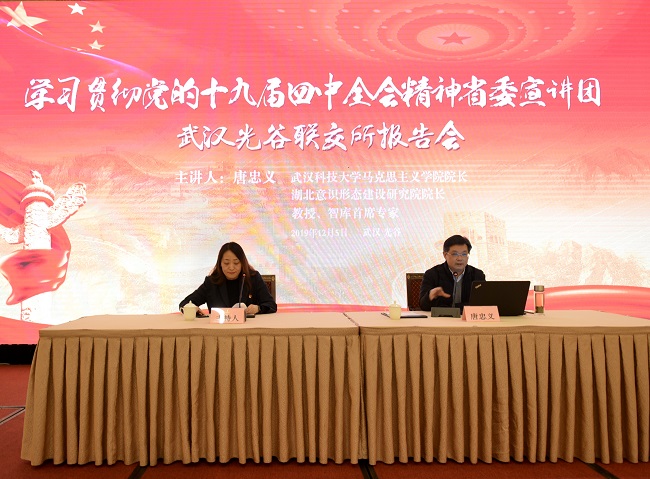 12月5日下午,我所举办学习贯彻党的十九届四中全会精神宣讲报告会,特邀武汉科技大学马克思主义学院院长,湖北意识形态建设研究院院长、智库首席专家、省委宣讲团成员唐忠义教授以《国家治理现代化的科学指南》为主题作宣讲报告。报告会由党委委员、副总经理杨静主持,所领导班子成员、本部及各控股子平台干部员工200余人参加,各市州公司干部员工100余人通过视频同步收看。