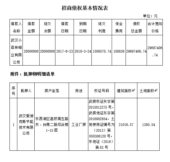 受委托,某银行拟将其持有对武汉小森林蜂业有限公司不良债权进行公开预招商,债权总计2969.74万元,其中借款金额2800万元、结欠余额2800万元、结欠利息150.85万元,意向价格2969.74万元。预招商时间为2018年10月25日至2018年11月8日。该债权抵押情况:由武汉爱迪克斯节能技术有限公司提供房产抵押担保,抵押物为位于武汉市东西湖区高桥南五路东、台南二路综合楼1-15层。具体情况如下: