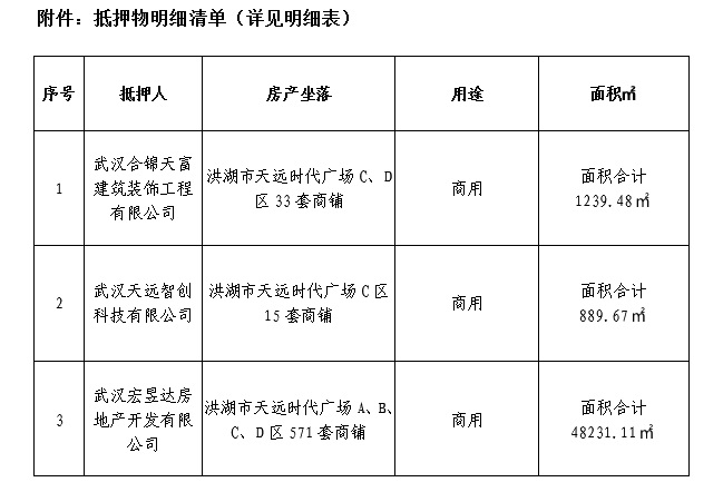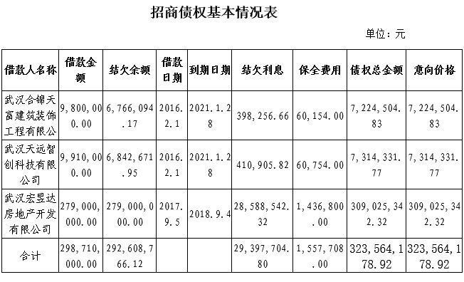 受委托,某银行拟将其持有的武汉宏昱达房地产开发有限公司、武汉合锦天富建筑装饰工程有限公司、武汉天远智创科技有限公司等不良债权进行公开预招商,债权总计323,564,178.92元,其中借款金额合计298,710,000.00元、结欠余额合计292,608,766.12元、结欠利息合计29,397,704.80元,意向价格合计323,564,178.92元。预招商时间为2018年11月20日至2018年12月4日。该债权抵押质押情况:由武汉合锦天富建筑装饰工程有限公司、武汉天远智创科技有限公司及武汉宏昱达房地产开发有限公司提供房产抵押,抵押物为位于洪湖市天远时代广场具体情况如下: