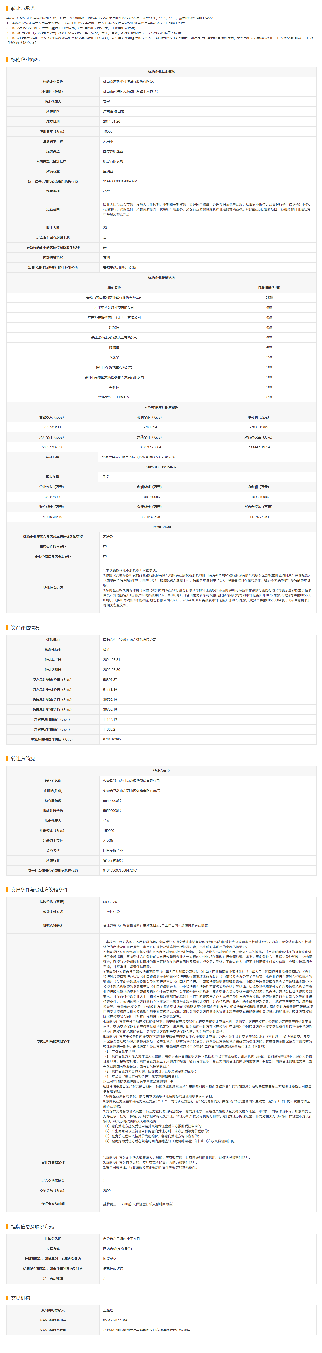 佛山南海新华村镇银行股份有限公司5950万股股份转让