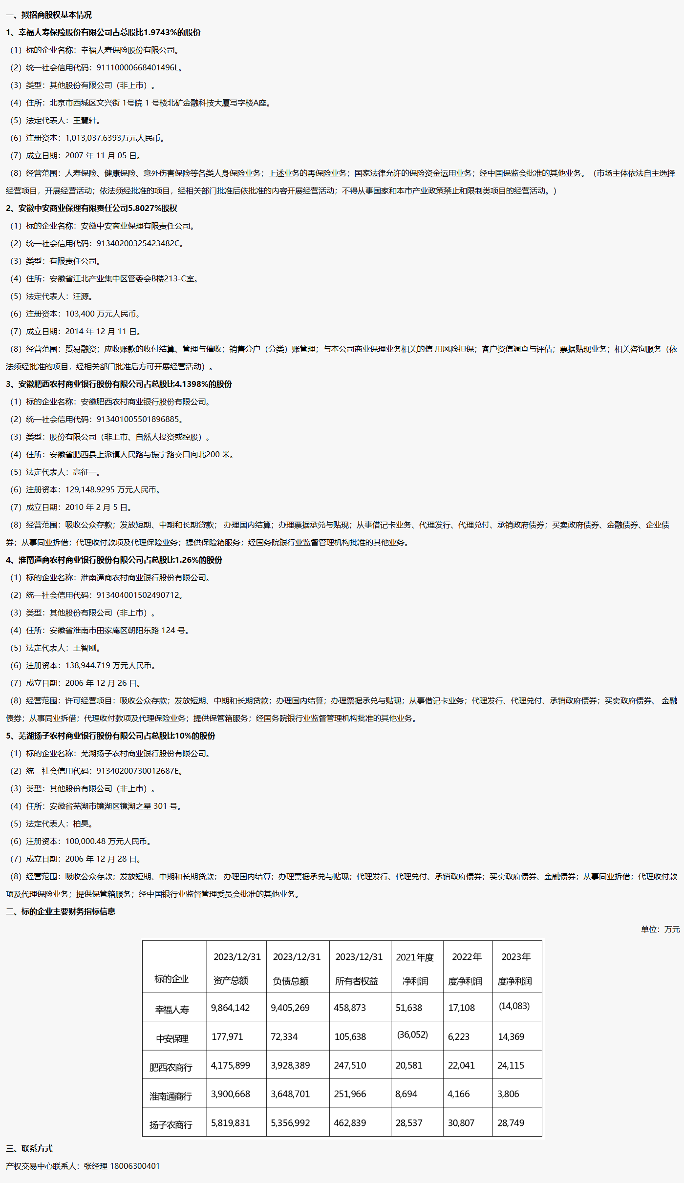 幸福人寿保险股份有限公司等5家公司股权招商公告