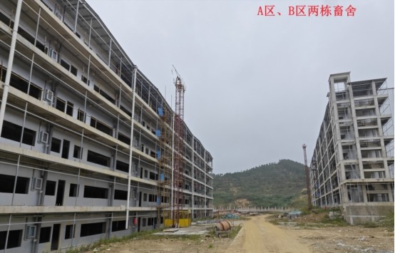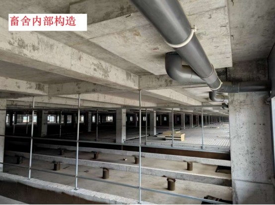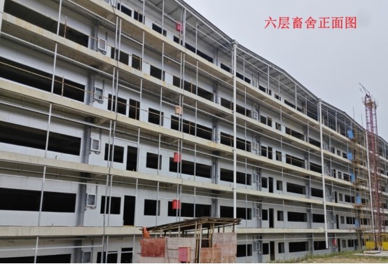 养殖基地主要包括两栋六层畜舍、辅助工程、公用工程、环保工程及办公及生活等设施。其中生产区为两栋六层畜舍及配套设施设备,两栋主楼畜舍占地面积为13549.12平方米,总建筑面积为78053.16平方米,是本项目的核心区域。环保工程包含污水处理及固废治理等均达到环保部门设计要求。