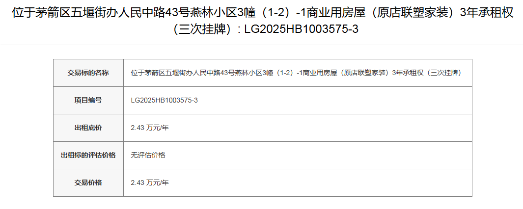 位于茅箭区五堰街办人民中路43号燕林小区3幢(1-2)-1商业用房屋(原店联塑家装)3年承租权